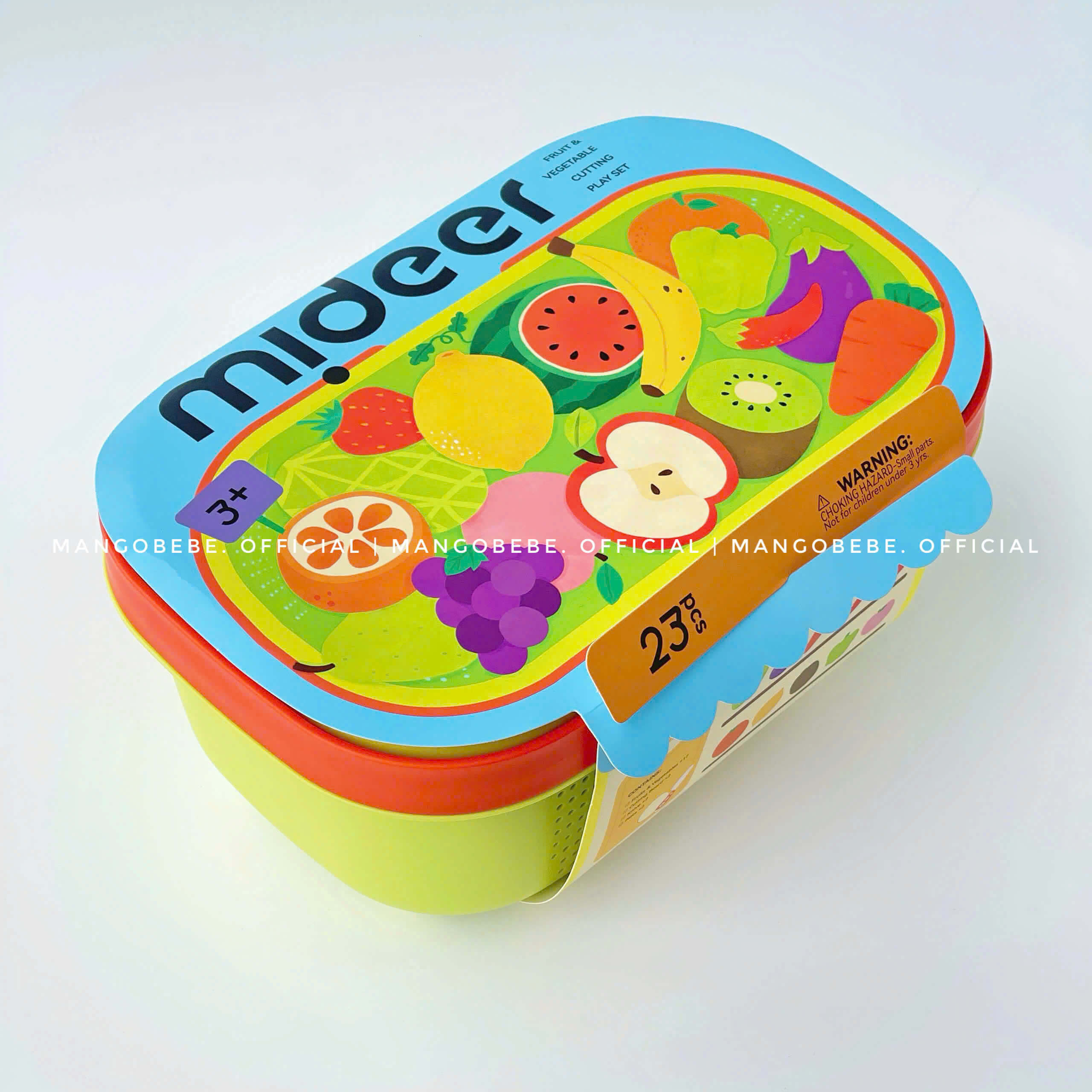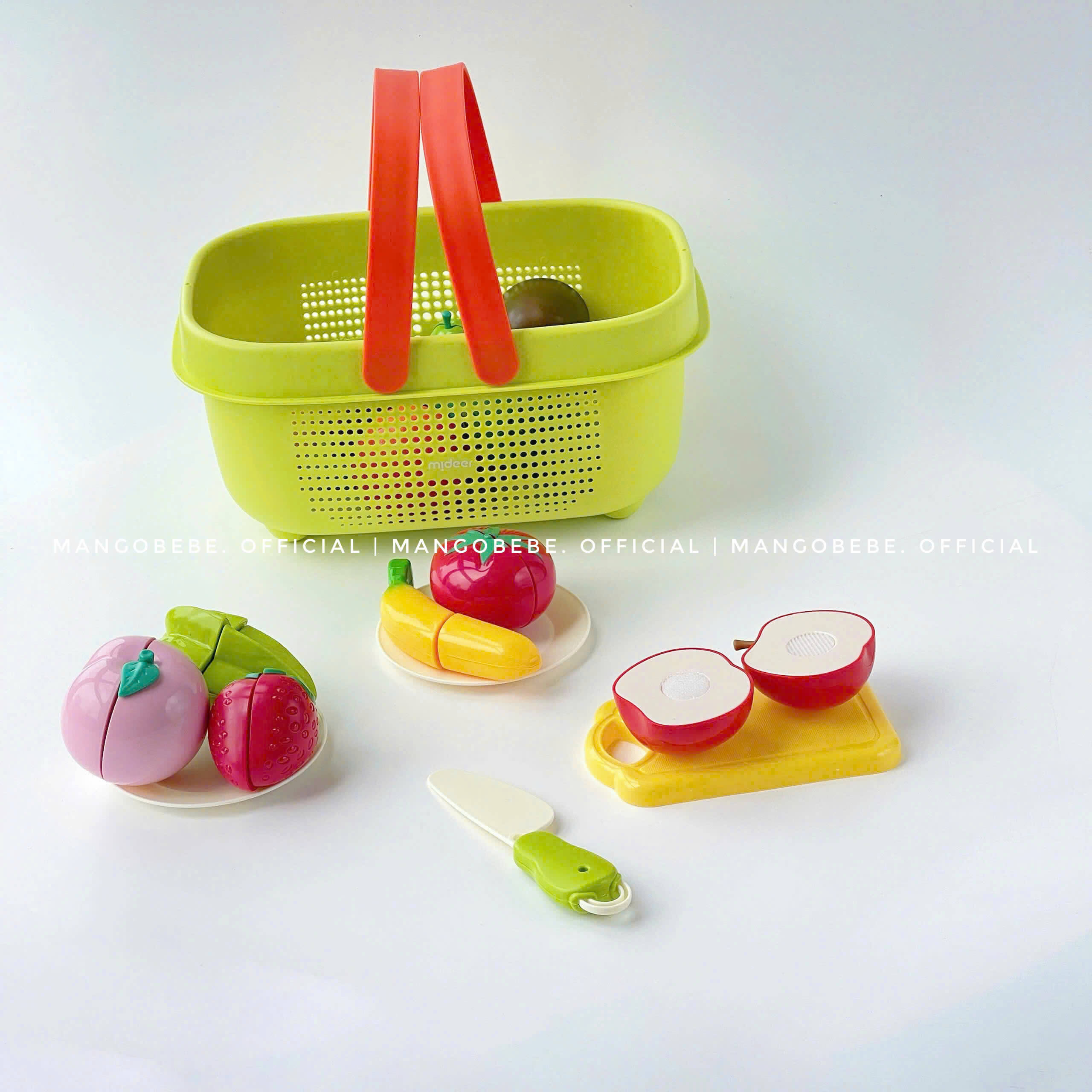 Set bao gồm các loại rau củ quả, dao thớt để bé cắt các loại rau củ, trái cây, đóng vai nấu ăn, đi picnic, dã ngoại… Qua đó giúp bé làm quen 17 loại rau củ đa dạng như khế, dâu tây, cà tím, cà chua, nhận biết các loại hình khối và màu sắc. Được làm từ chất liệu an toàn, các góc bo tròn mịn màng, không thể so sánh với các bộ rau cũ không rõ nguồn gốc trên thị trường mom nha.